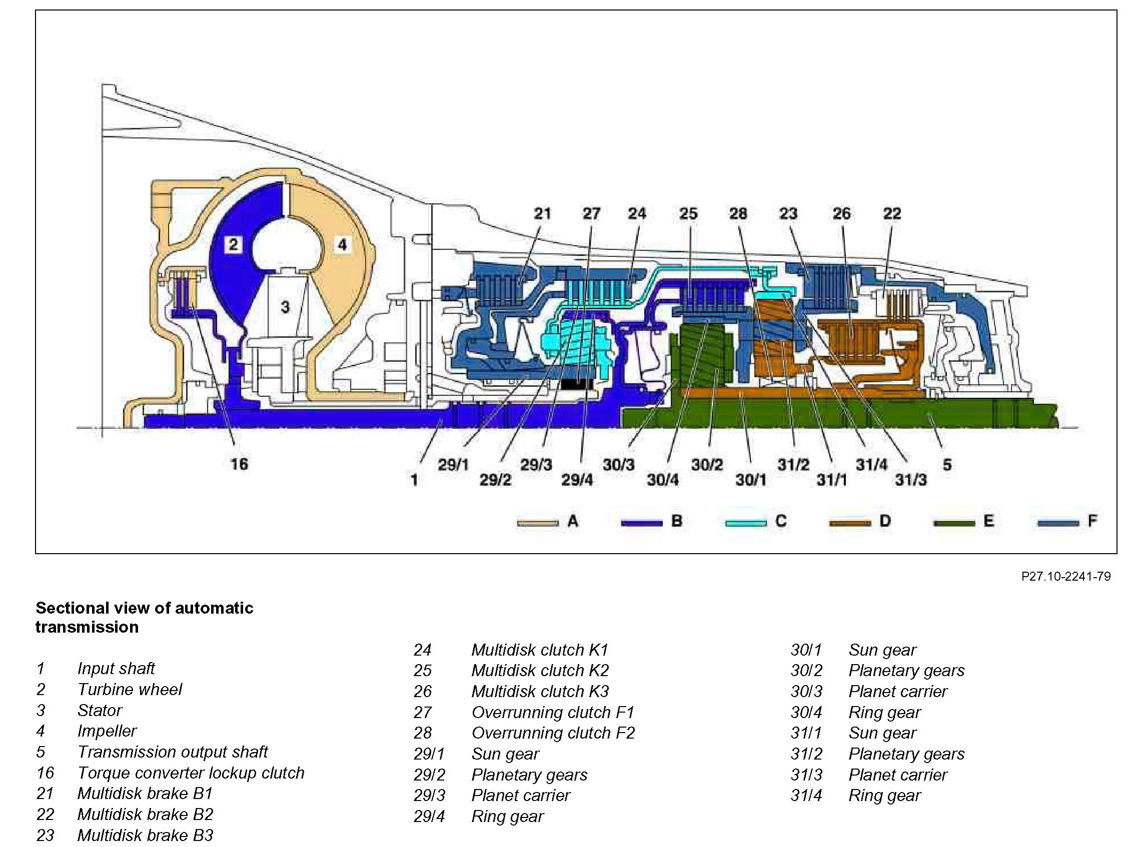 The input shaft (1) drives the ring gear (29/4). In drive mode, the sun gear (29/1) is supported at the housing via the locked overrunning clutch F1 (27) and, in overrun mode, via the engaged multidisk brake B1 (21). The planetary gears (29/2) roll on the fixed sun gear (29/1) and take care of a torque increase when the power is transmitted from the ring gear (29/4) to the planet carrier (29/3). The planet carrier (29/3) moves at reduced speed in the direction of engine rotation.