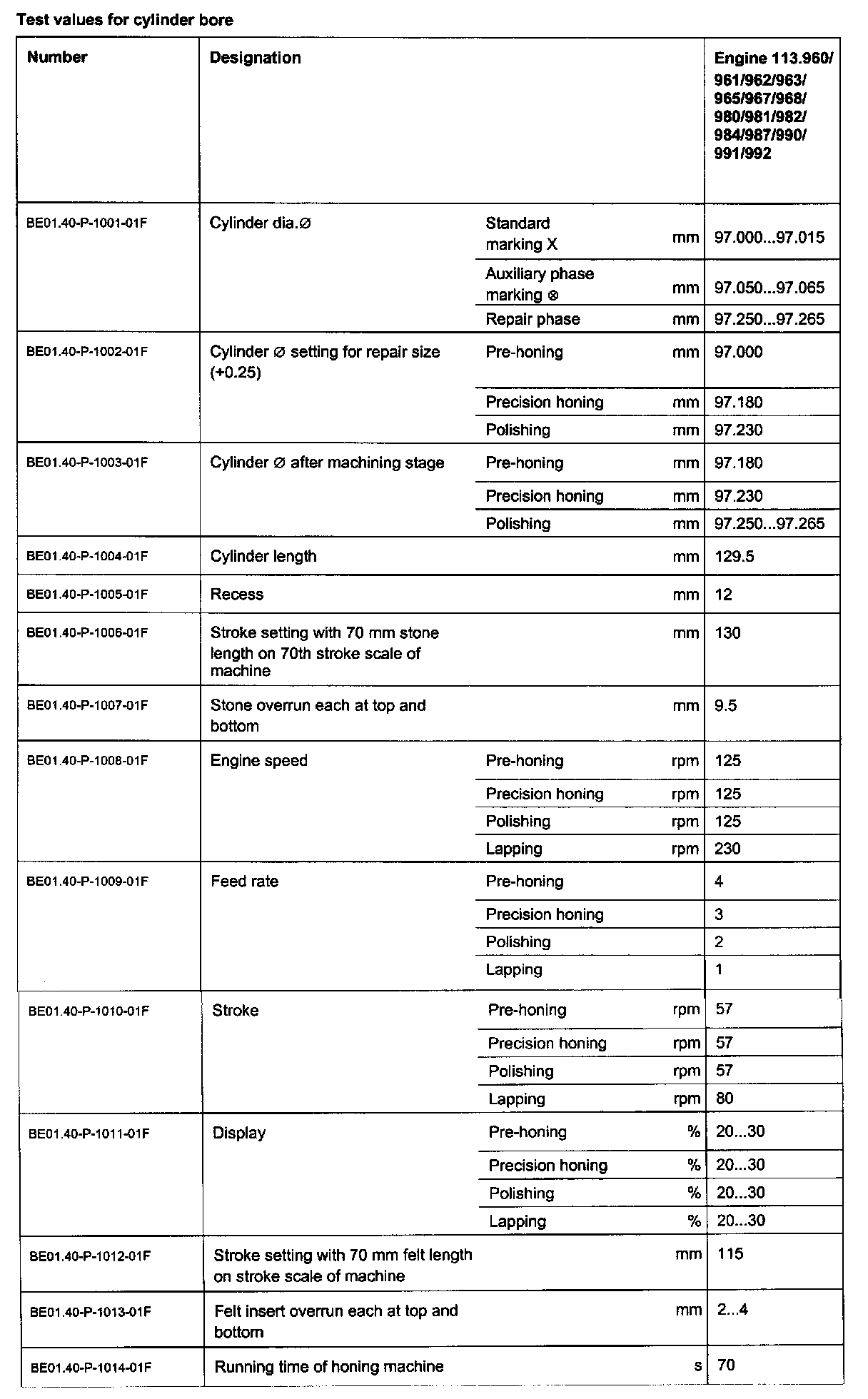 Test values for cylinder bore
