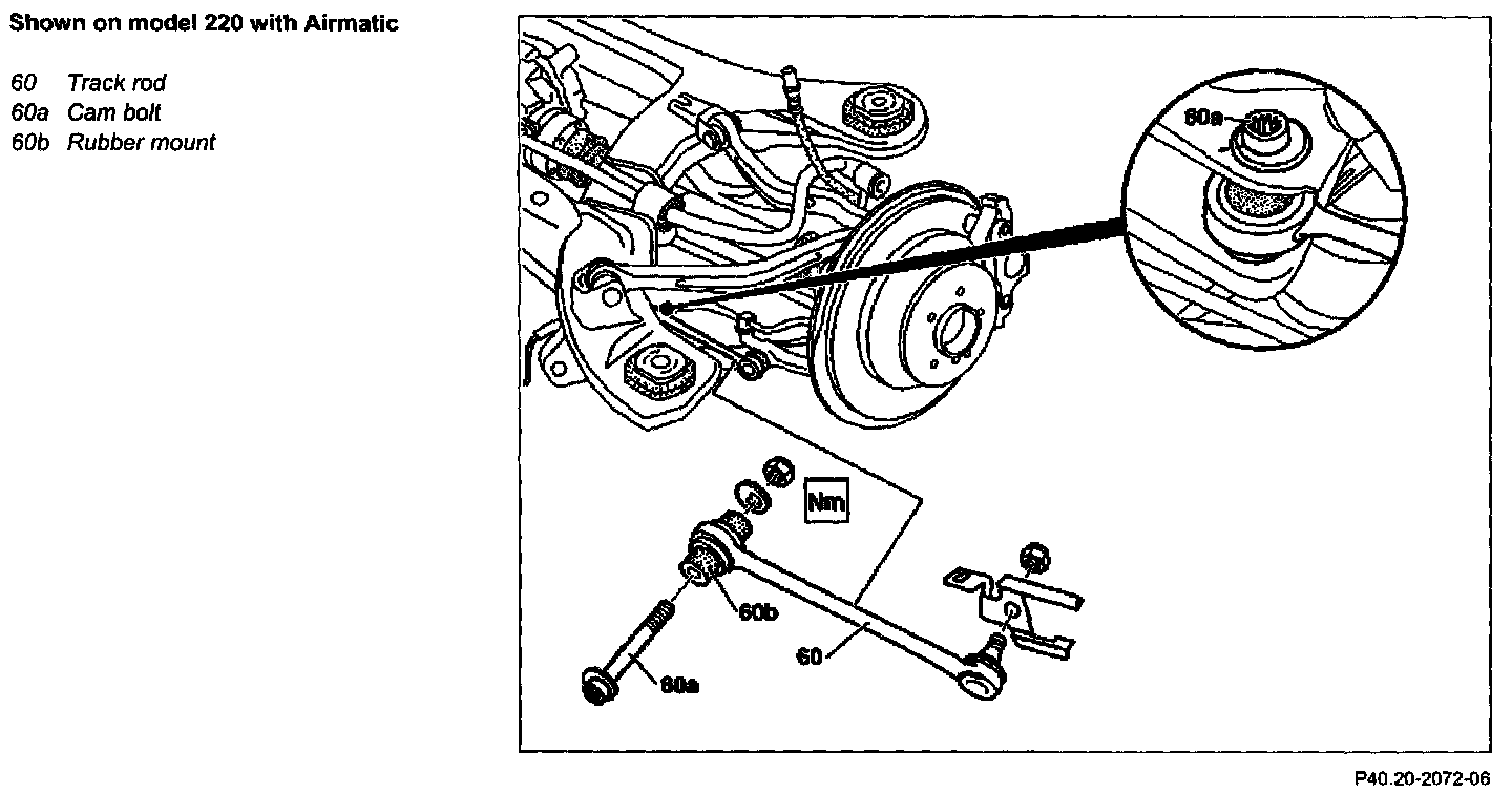 2 Adjust toe-in with cam bolt (60a) at the mount of the left and right tie rod (60) at the rear axle carrier