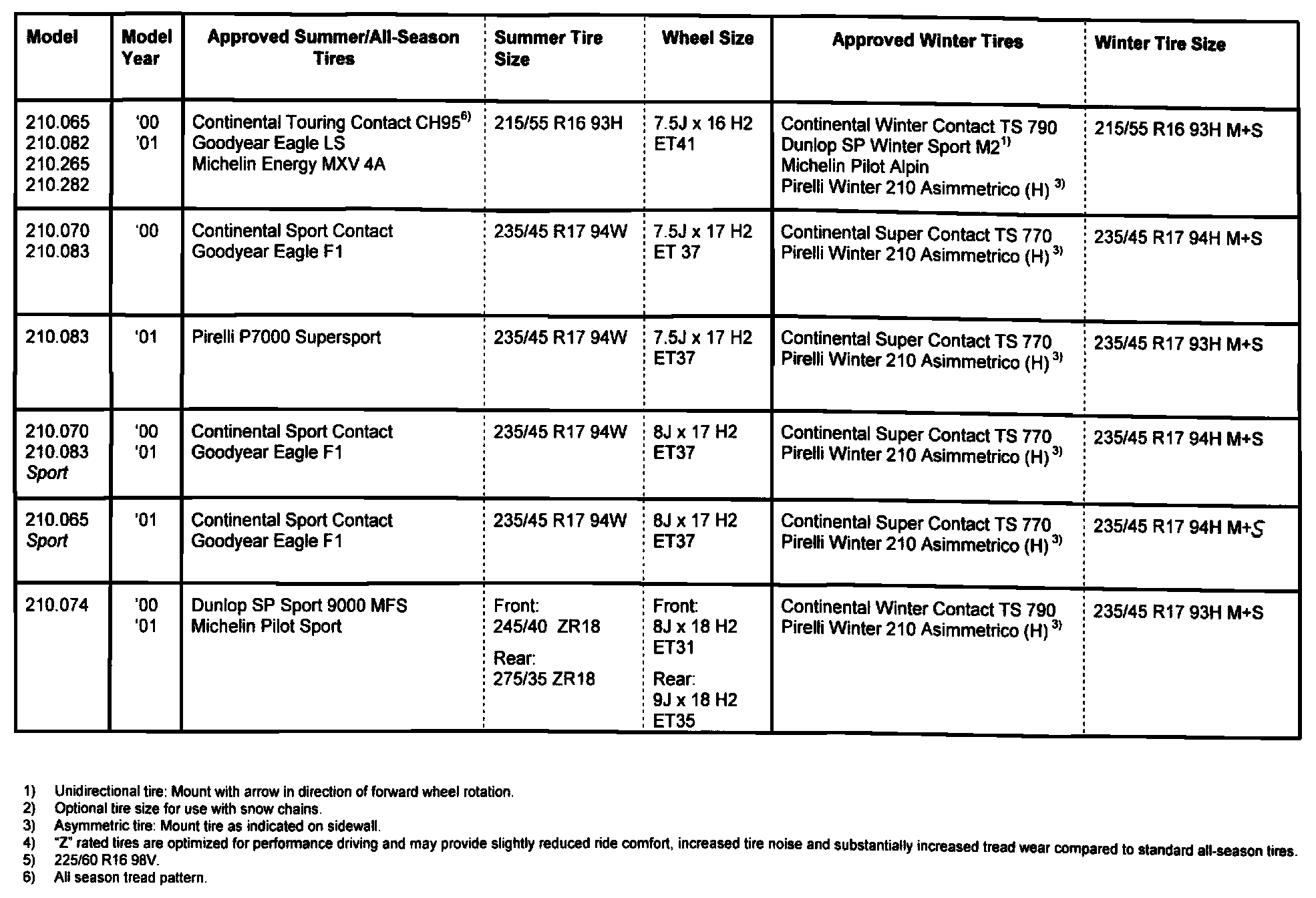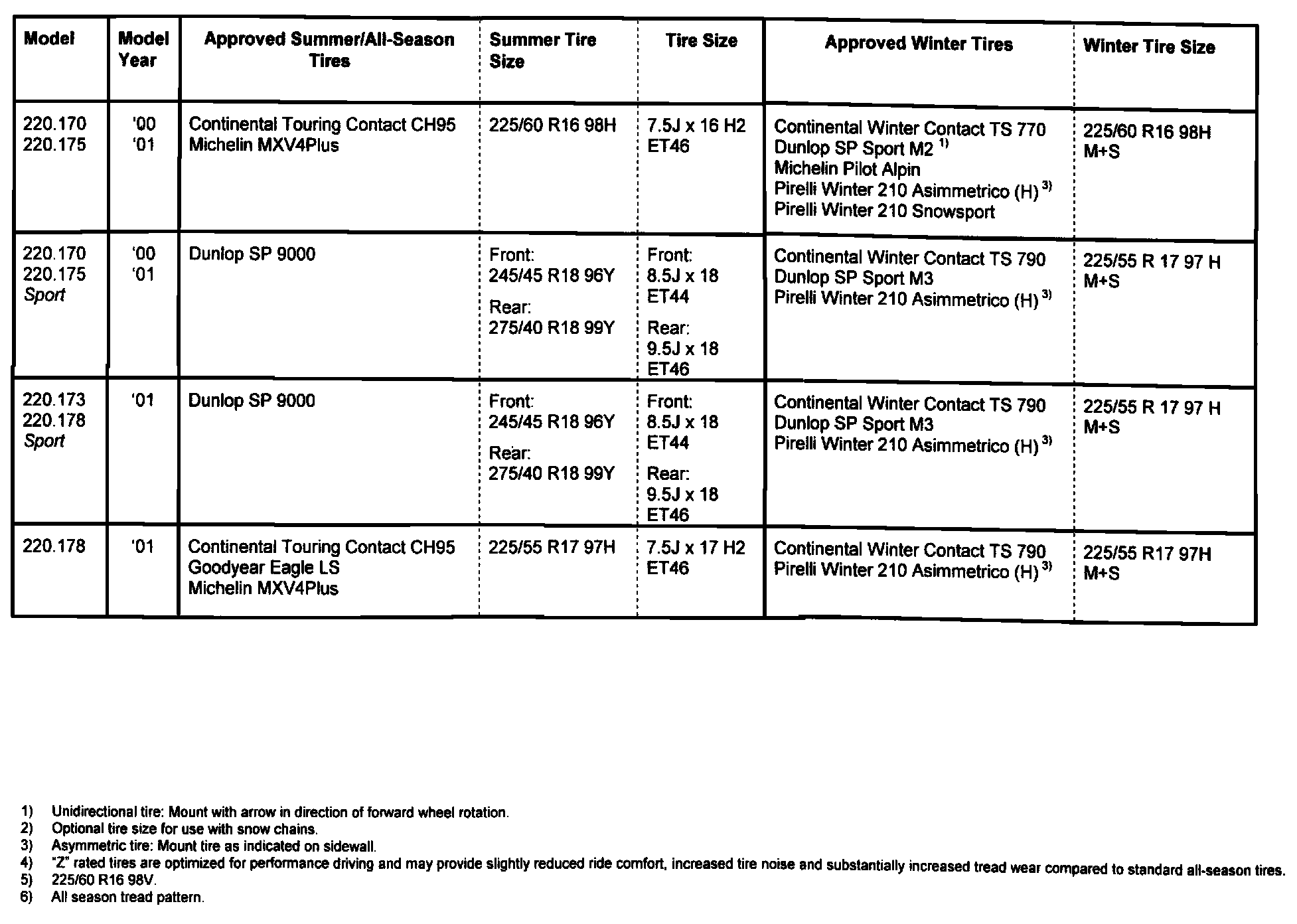 This following is a list of summer/winter tires and snow chains currently approved by DaimlerChrysler AG for all Mercedes-Benz models sold in the USA by MB USA starting with model year 2000. A chart showing the maximum speed ratings is also included.