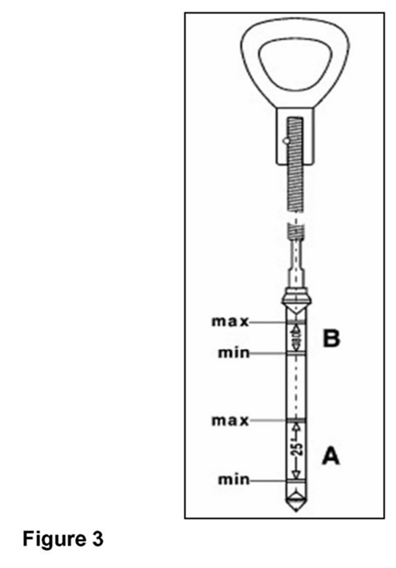 6. Remove breakaway locking tab from dipstick and check fluid level; the fluid level must be between the mm and max marks (A, Figure 3).