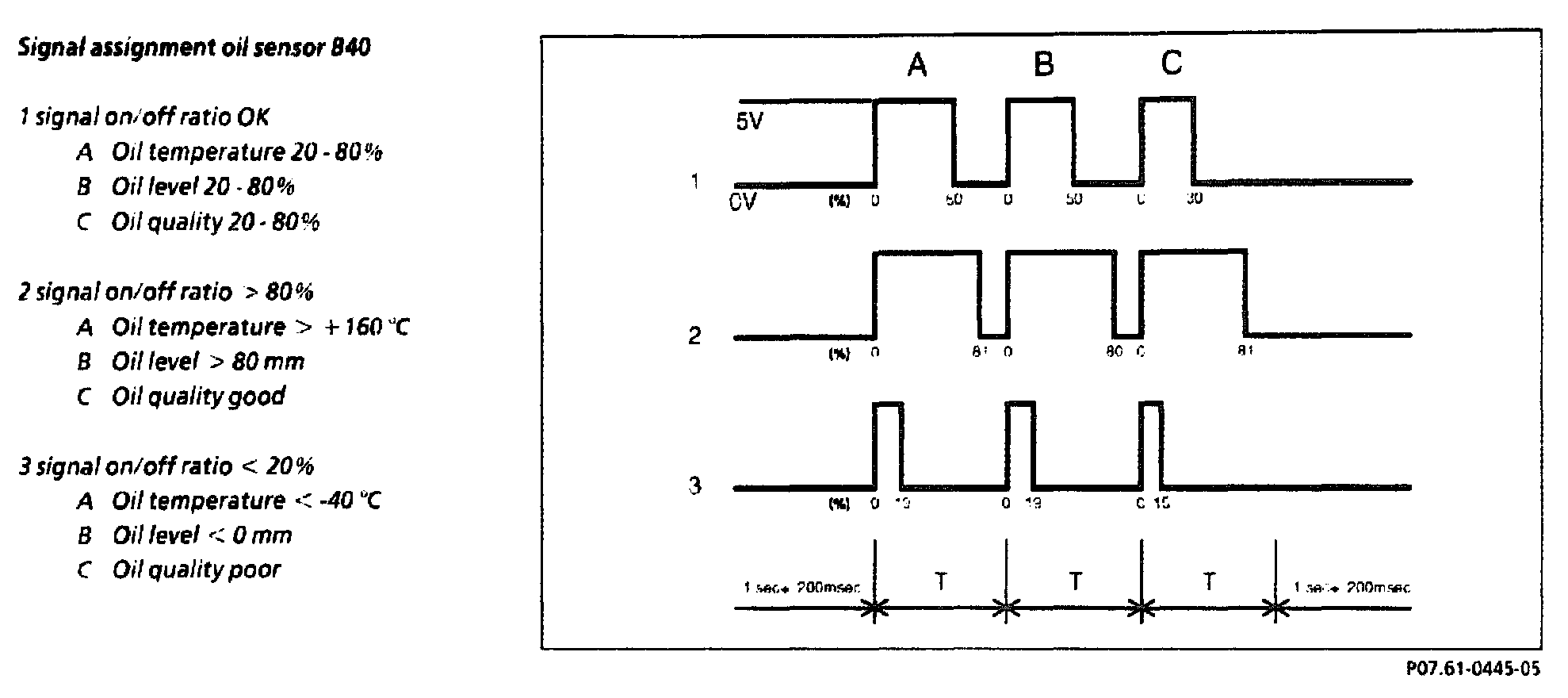 The information is constantly transmitted as a PWM signal to the engine control module and over the CAN to the instrument cluster. Each information block consists of three successive square- wave signals, followed by a short pause. This is followed by a short pause. A measured variable is assigned to each square wave signal (A, B, C). The relative quantification is carried Out on the basis of the on/off ratio of approx. 19 - 81 %.