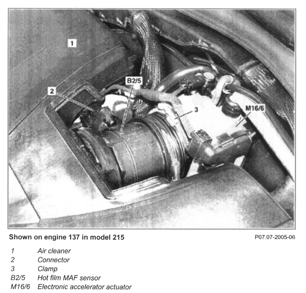 2 Unplug connector (2) of electrical connection of hot film mass air flow sensor (B2/5)