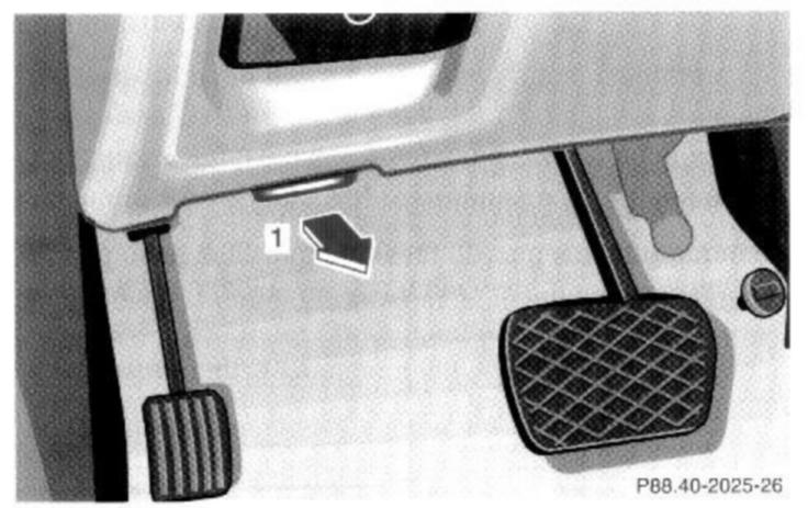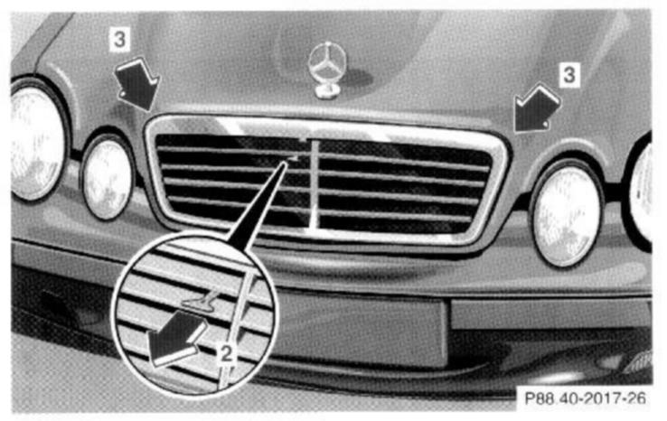 To unlock the hood, pull release lever (1) under the driver's side of the instrument panel. At the same time a handle will extend out of the radiator grill (it may be necessary to lift the hood up slightly).