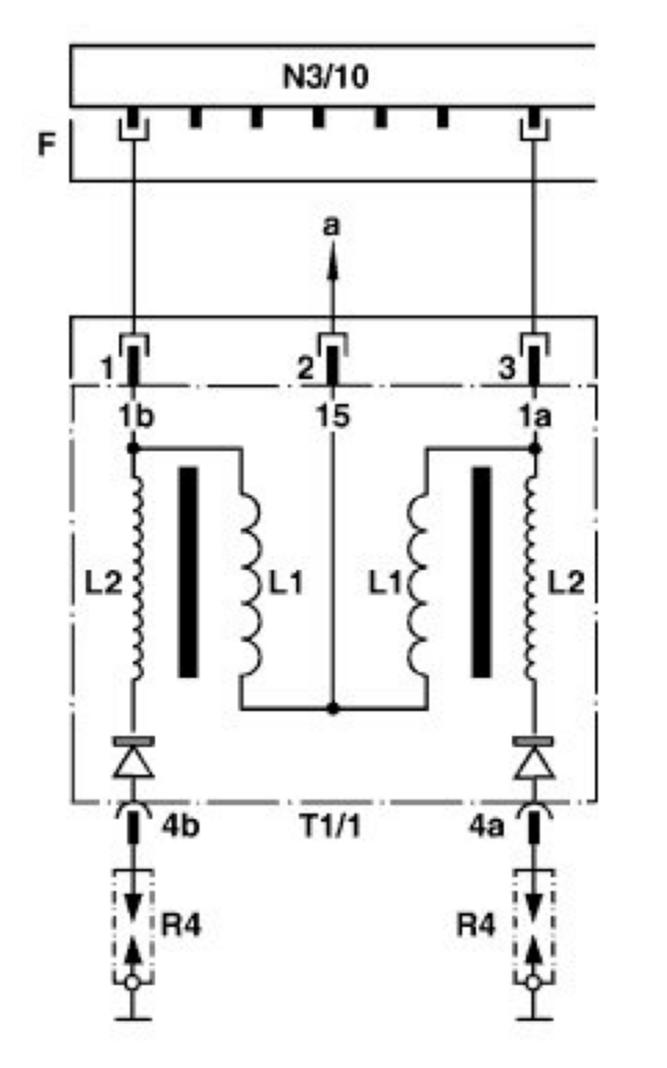 The primary current flow is interrupted at the moment of ignition timing point. As a result of the sudden collapse of the magnetic field the ignition voltage is generated in the secondary windings (L2). The ignition voltage flows through the high voltage connection (4a and 4b) and through the spark plug connector to the respective spark plug (R4).