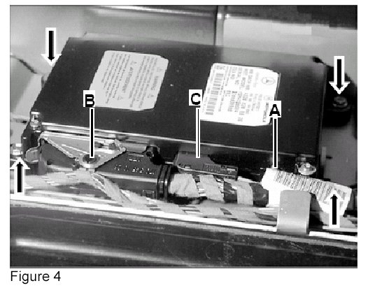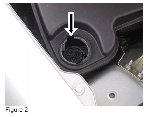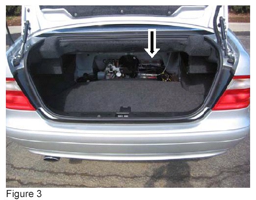 3. Remove the analog Tele Aid control module from the electronics tray behind the rear seat (Arrow, Figure 3) by removing the four M6 screws (Arrows, Figure 4).