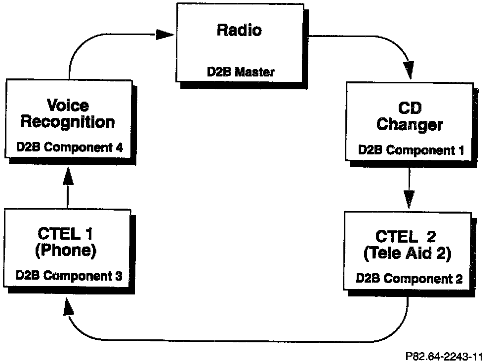 The diagram is an example of a D2B ring configuration including all components. Some installations will not include all of the components shown in the example. If a component is not present, connect the preceding component to the one following the component not present. Only vehicles with COMAND include the Tele Aid 2 module in the D2B ring. Refer to S-SI-82.64/135, D2B Fiber Optic Configuration and Version Coding for proper handling and configuration of D2B fibers.
