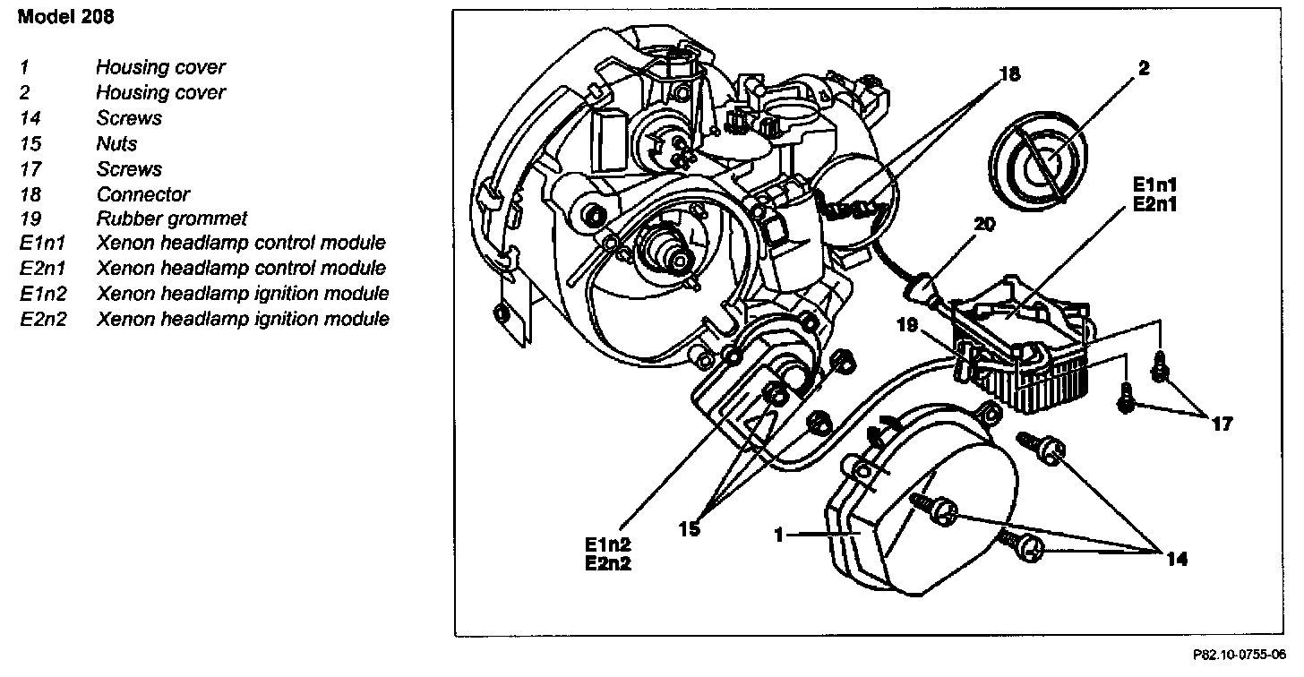 8 Press out grommet (19) and remove xenon headlamp control module (E1n2, E2n2) with xenon headlamp ignition module (E1n1, E2n1)