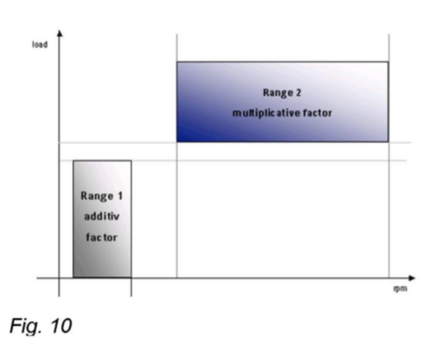 In the idle speed range, the additive factor can also be affected by the multiplicative factor. For example, if the multiplicative factor (adapted in range 2) at idle speed is too large, the additive factor (adapted in range 1) will adapt in a negative direction.
