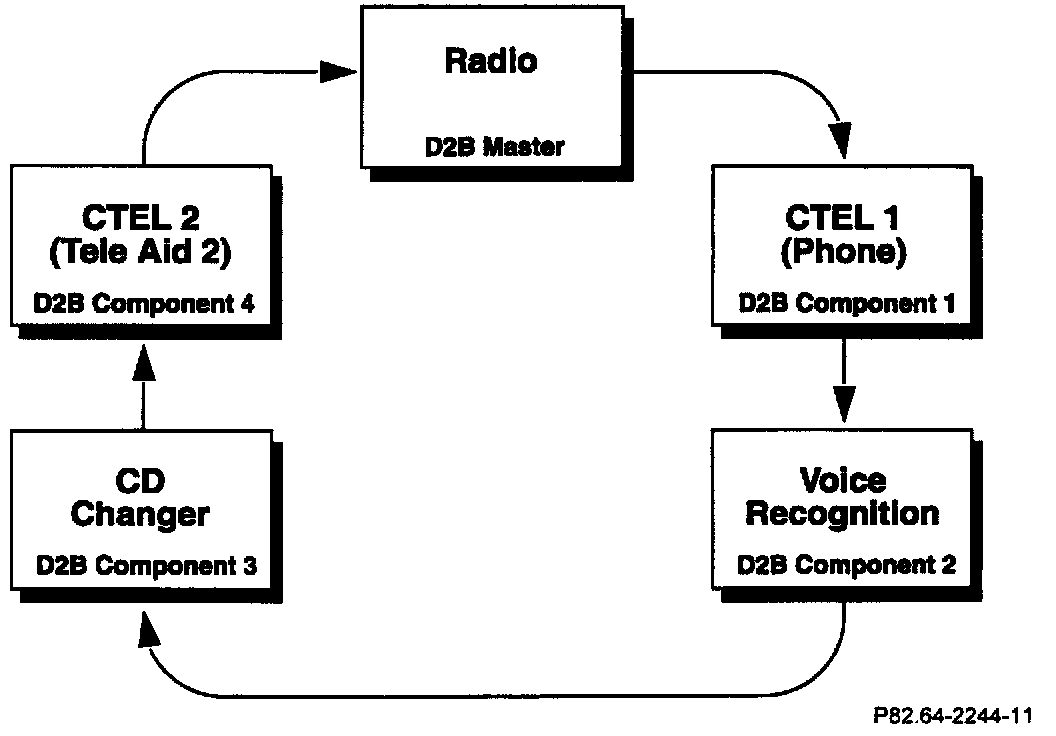 The diagram is an example of a D2B ring configuration including all components. Some installations will not include all of the components shown in the example. If a component is not present, connect the preceding component to the one following the component not present. Vehicles with COMAND include the Tele Aid 2 module in the D2B ring. Refer to S-SI-82.64/135, D2B Fiber Optic Configuration and Version Coding for proper handling and configuration of D2B fibers.