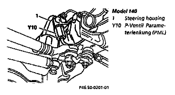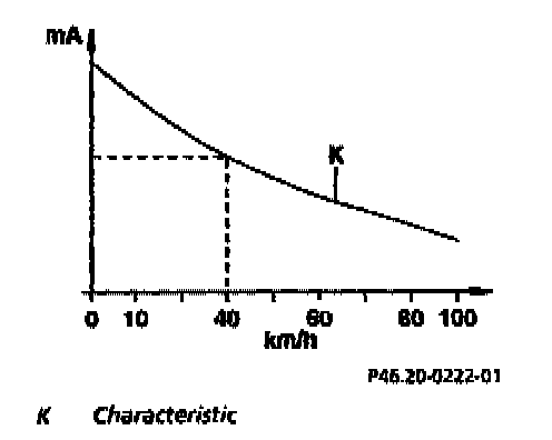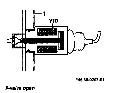 The P-valve is actuated in cycles with approx. 6V by the ETS, ASR or ESP control module (N47-1, N47-2, N47-5). As vehicle speed increases the current flow reduces and the P-valve opens the control restrictor continuously in accordance with a characteristic (K) defined in the control module. Consequently the oil flow is controlled and also the steering wheel torque.
