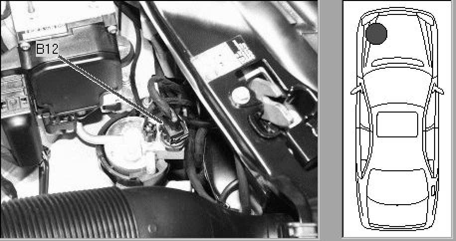 The refrigerant pressure sensor (B12) is located on the receiver/drier (1) in the engine compartment at the front left.