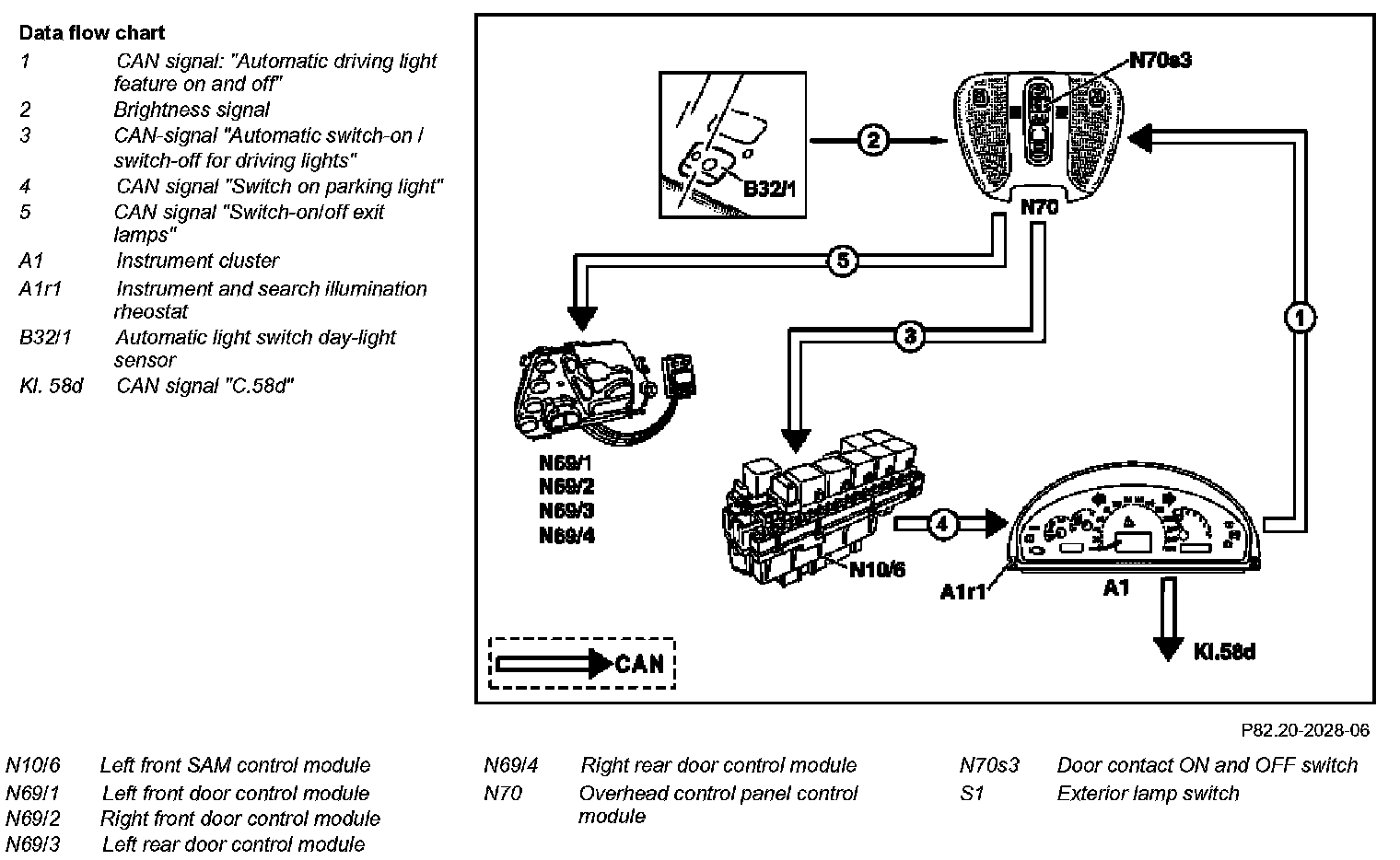 - The left front SAM control module (N10/6) receives the signal and generates the CAN signal "switch on parking lights" (4).