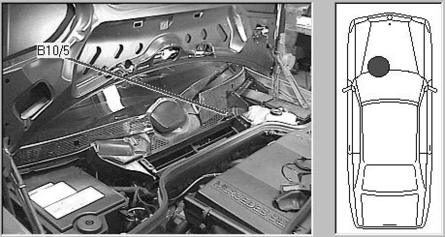 Rear center of engine compartment, at air duct