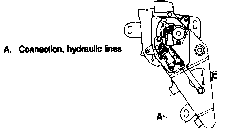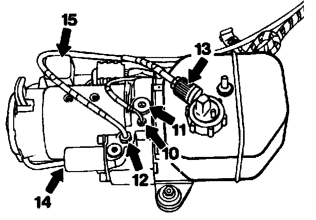 A 12 V hydraulic pump is used to supply pressure to the entire system. The system pressure is limited to max. 180 + 10 bars by a pressure limitation valve (DBV). The hydraulic unit has 4 connections (No. 10 roll bar drive, No. 11 test connection, No. 12 top drive, No. 13 return). The hydraulic unit is located in the spare tire recess.