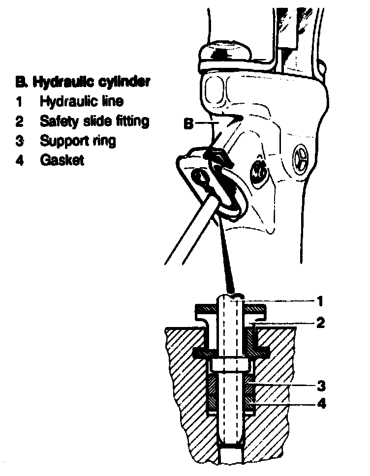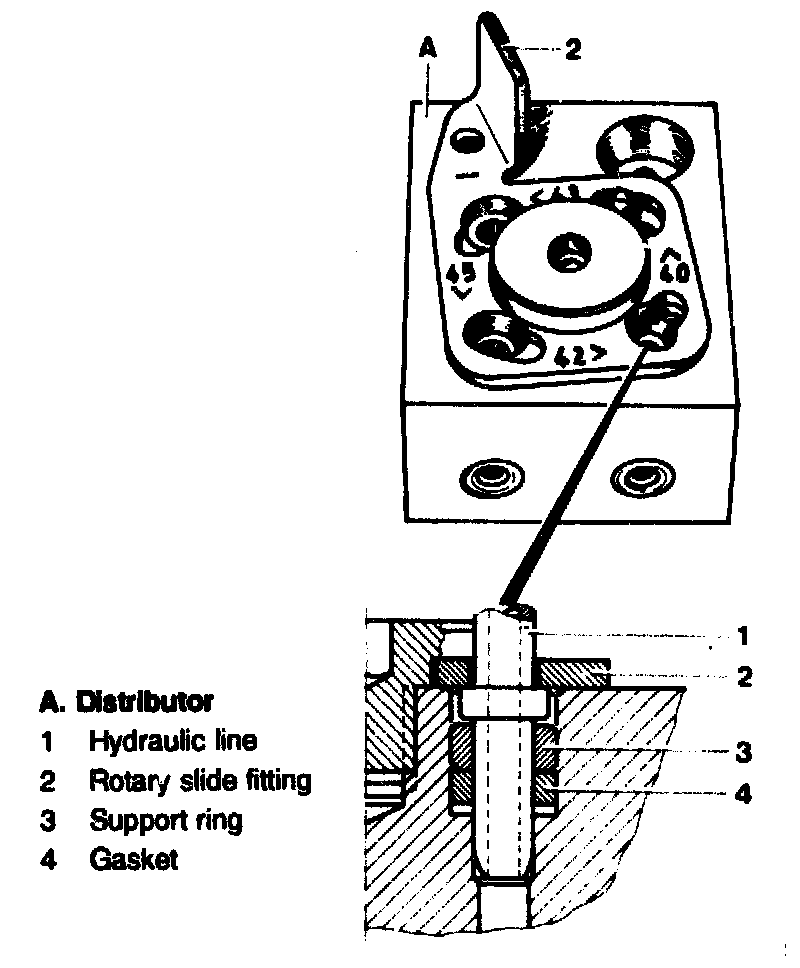The hydraulic lines are connected to the valve blocks and distributors with rotary slide fittings and to the cylinders with safety slide fittings. The supply lines from the pumps to the valve blocks are fastened with threaded fittings.