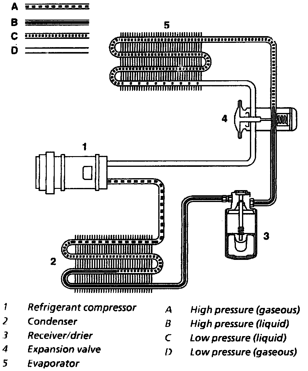 The heat from compression is removed from the refrigerant by the surface of the condenser (2). As it cools the refrigerant liquefies. As it flows through the receiver/drier (3) the refrigerant is purified of all chemical and mechanical impurities.