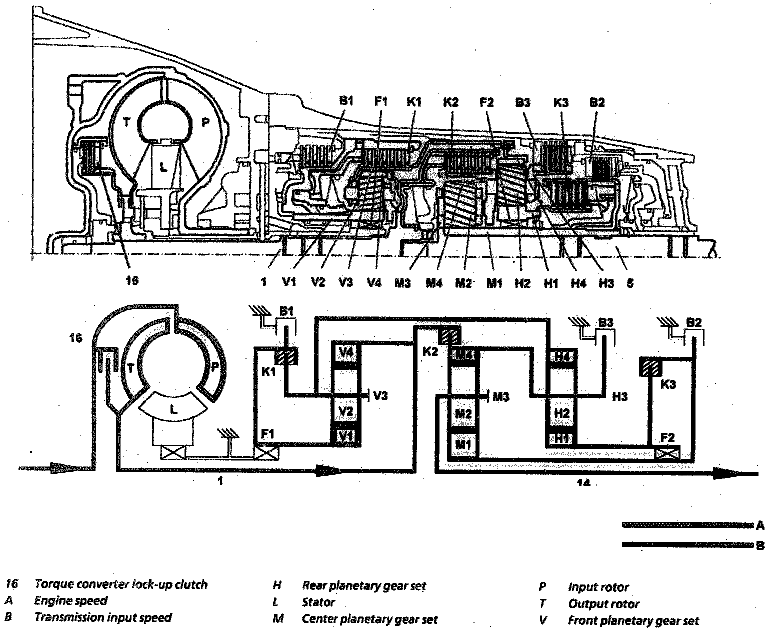 - No torque/speed conversion takes place due to the direct ratio of 4th gear (i=1). Power is transmitted from the input shaft (1) to the output shaft (5) via three locked planetary gear sets.