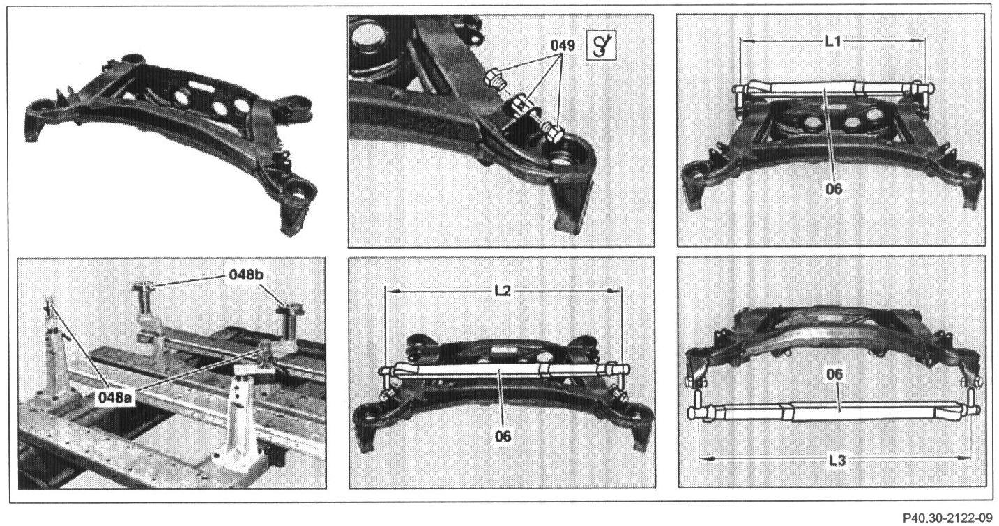 5 Place complete rear axle carrier (with half shaft) or as component on the checking fixture (048a, 048b)