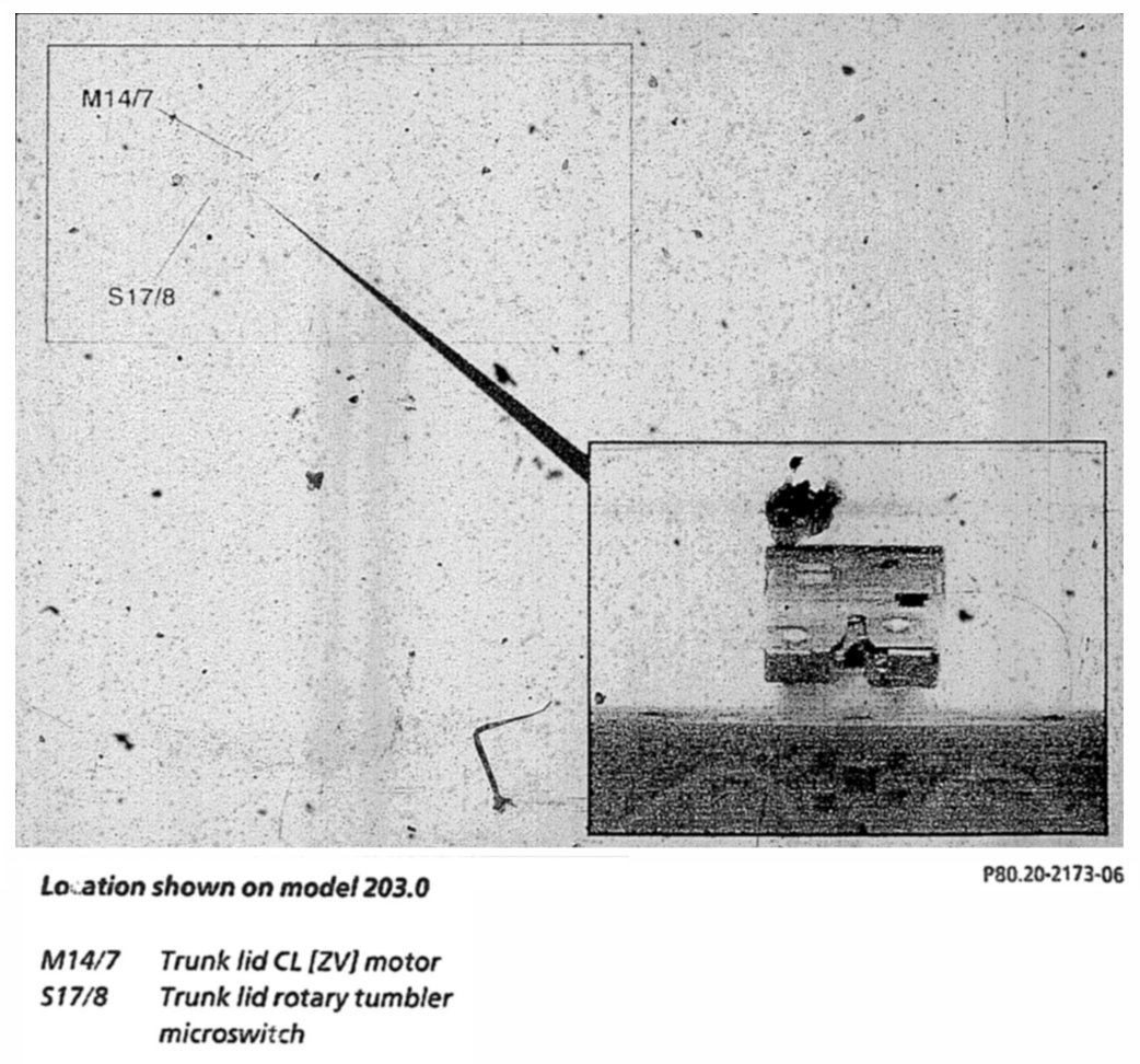 The trunk lid lock consists of three components: the lock (rotary tumbler), the lock cylinder and the trunk lid external operation switch (S88/8), which is located beside the lock cylinder. The rotary tumbler houses the trunk lid rotary tumbler microswitch (S17/8).