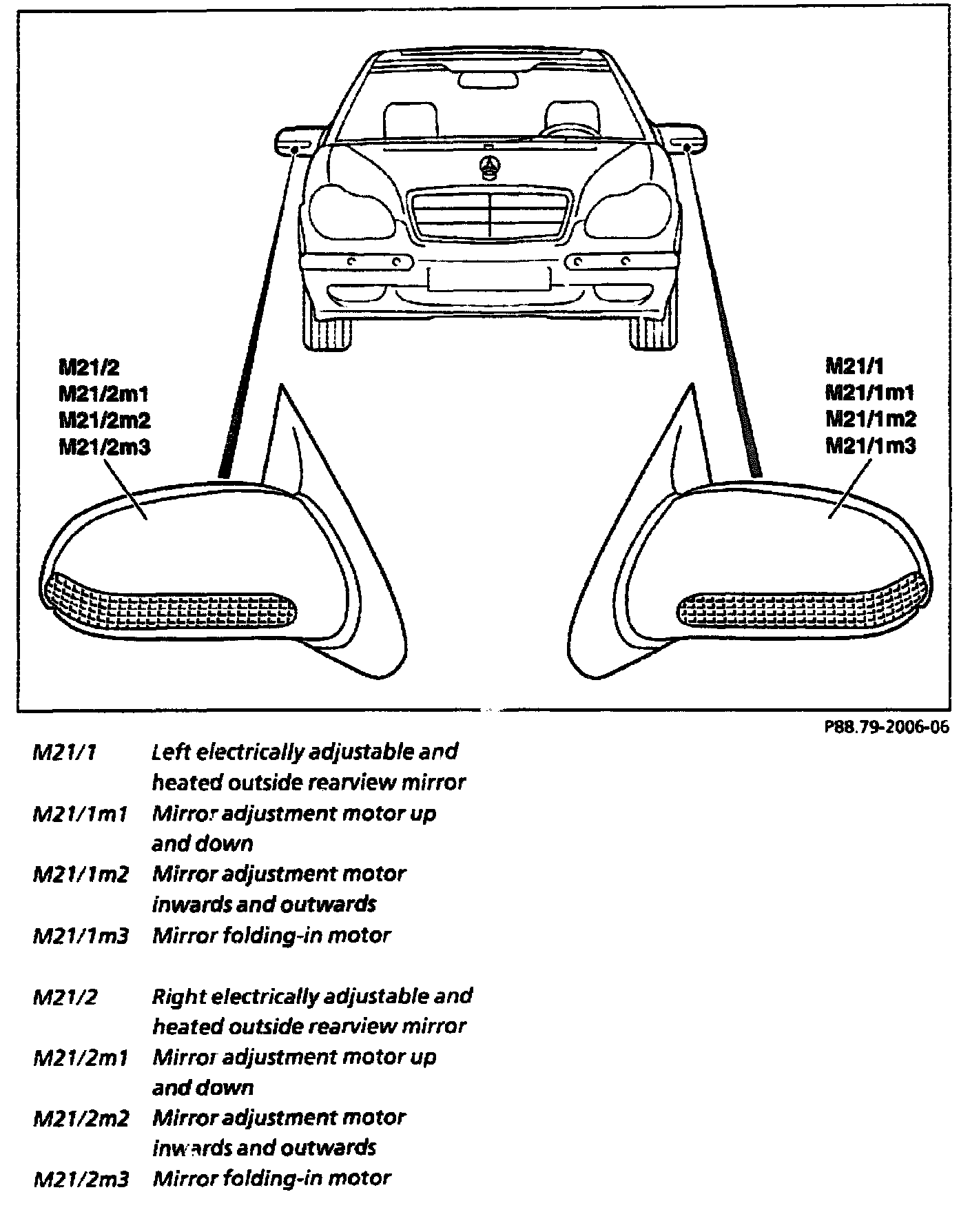 The motors for adjusting the mirror glass and the mirror housing are located in the housing for the left electrically adjustable and heated outside rearview mirror (M21/1), right electrically adjustable and heated outside rearview mirror (M21/2).