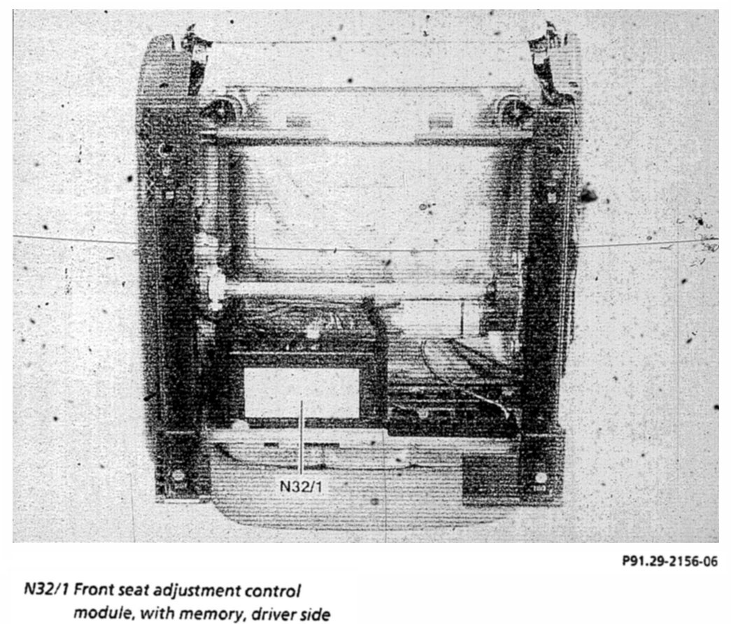 The front seat adjustment control module. with memory, driver side (N32/1) is located below the seat on the seat frame.