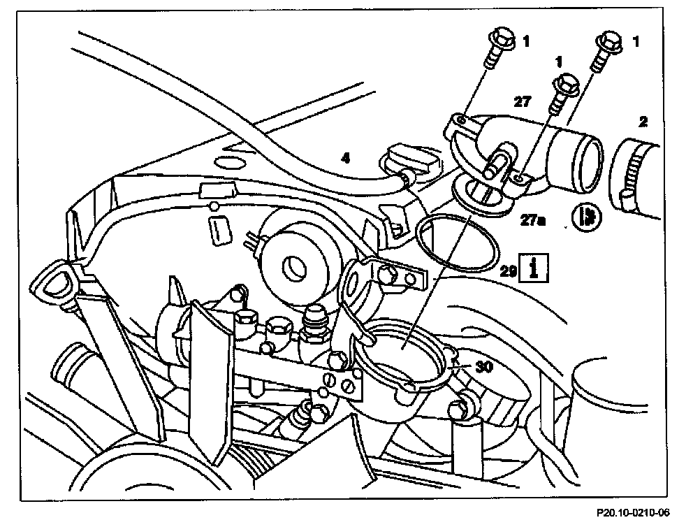 5 Unscrew and remove cover (27) of coolant thermostat housing (30) with coolant thermostat (27a)