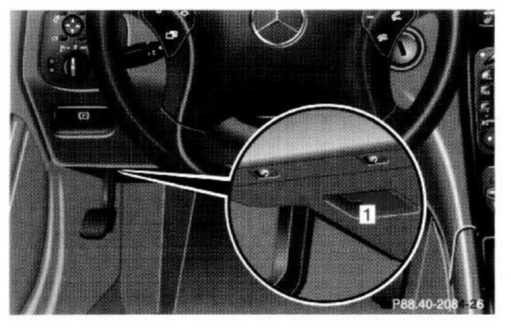 To unlock the hood, pull release lever (1) under the driver's side of the instrument panel. At the same time a handle will extend out of the radiator grill.