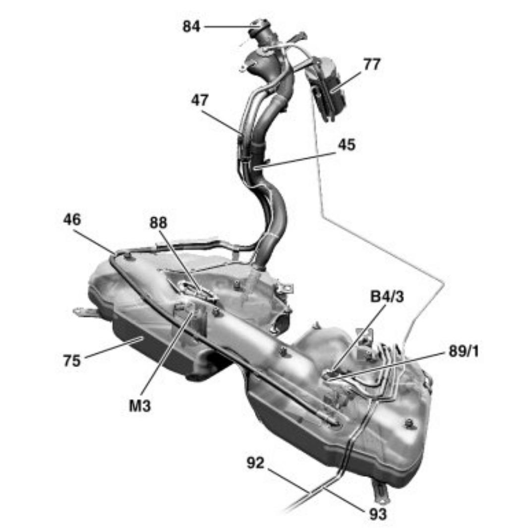 The fuel delivery module (88) together with the fuel pump (M3) is located in the right chamber of the fuel tank.