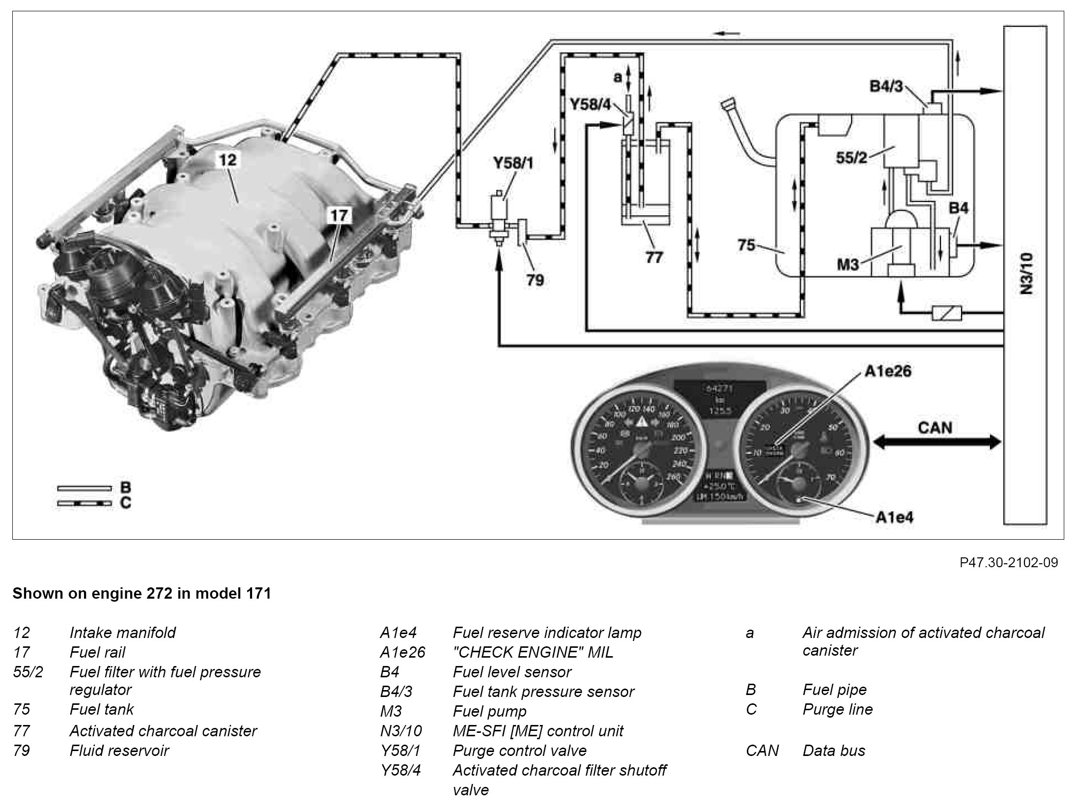 If the ME-SFI [ME] control unit detects a system with a substantial major leak, the fuel reserve indicator lamp in the instrument cluster blinks and the message "CHECK FILLER CAP" appears in the multifunction display (A1).
