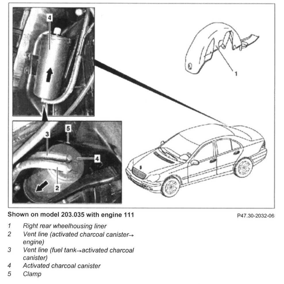 4 Detach vent line (activated charcoal canister ->Motor) (2) and vent line (fuel tank -> Activated charcoal canister) (3) activated charcoal canister (4)
