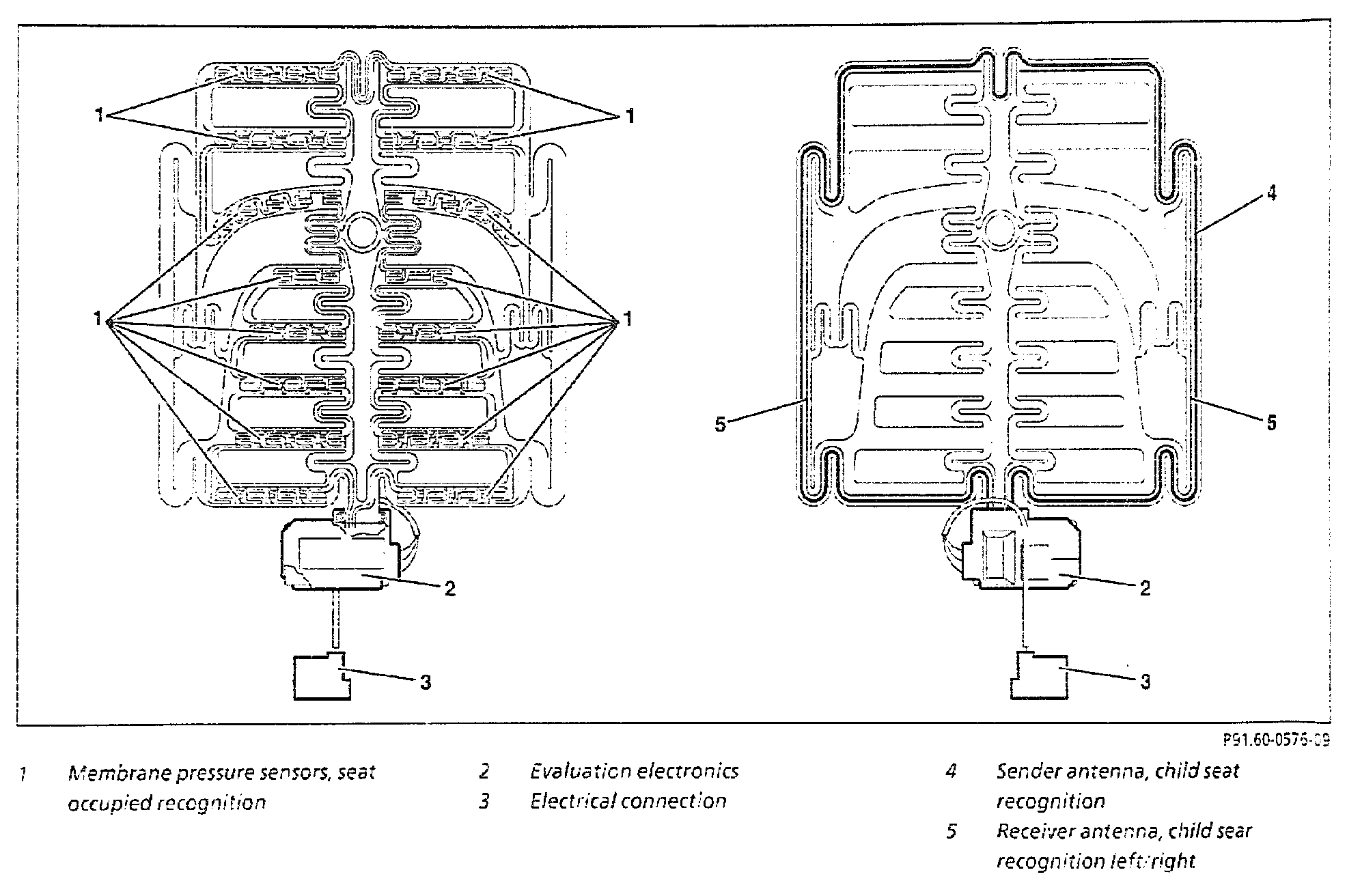 This resistance structure, as well as the sender and receiver antennae in the sensor mat, are electrically connected to the evaluation electronics in the front passenger seat, which in turn is connected via a data line to the control module for seat belt tensioning (GUS) with airbag (AB) or restraint systems control module (N2/2 or N2/7).