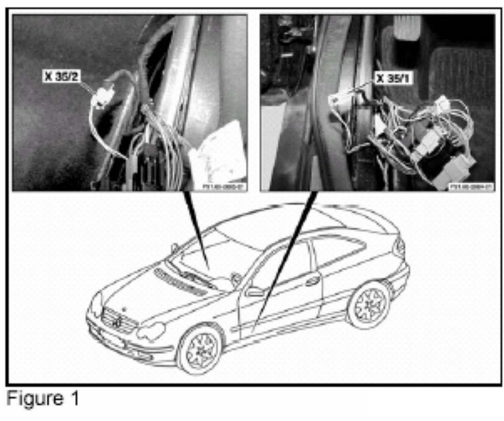 4. Expose wiring harness. Figure 1 shows connector for front doors X35/1 (left front door separation door separation point) and X35/2 (right rear door separation point) are similar. Wiring diagram of airbag control module with integrated E-call system can be found in WEB ETM document 91.60-U-2101FA.