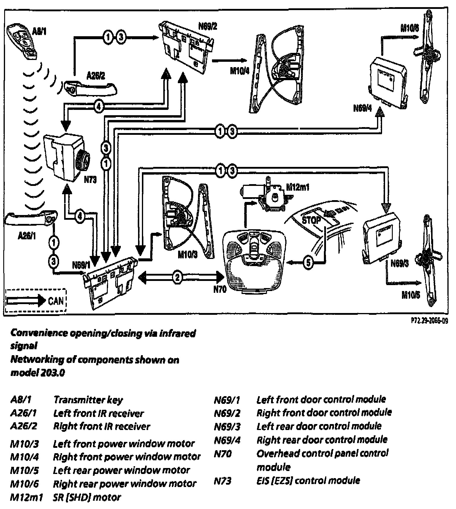 The respective door control modules (N69/1, N69/2, N69/3, N69/4) receive the CAN message for convenience closing and actuate the power window motors (M10/3, M10/4, M10/5, M10/6). The motors are actuated for as long as the transmitter key button is pressed, though for no longer than 25s.