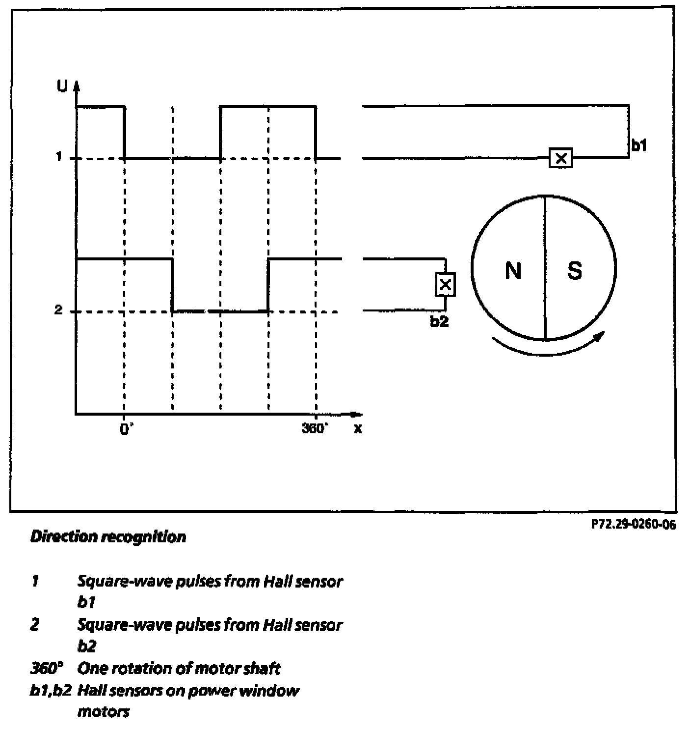 From the time difference between the pulses from Hall sensor b1 and the pulses from Hall sensor b2 the relevant control module recognizes the rotation direction of the power window motor.