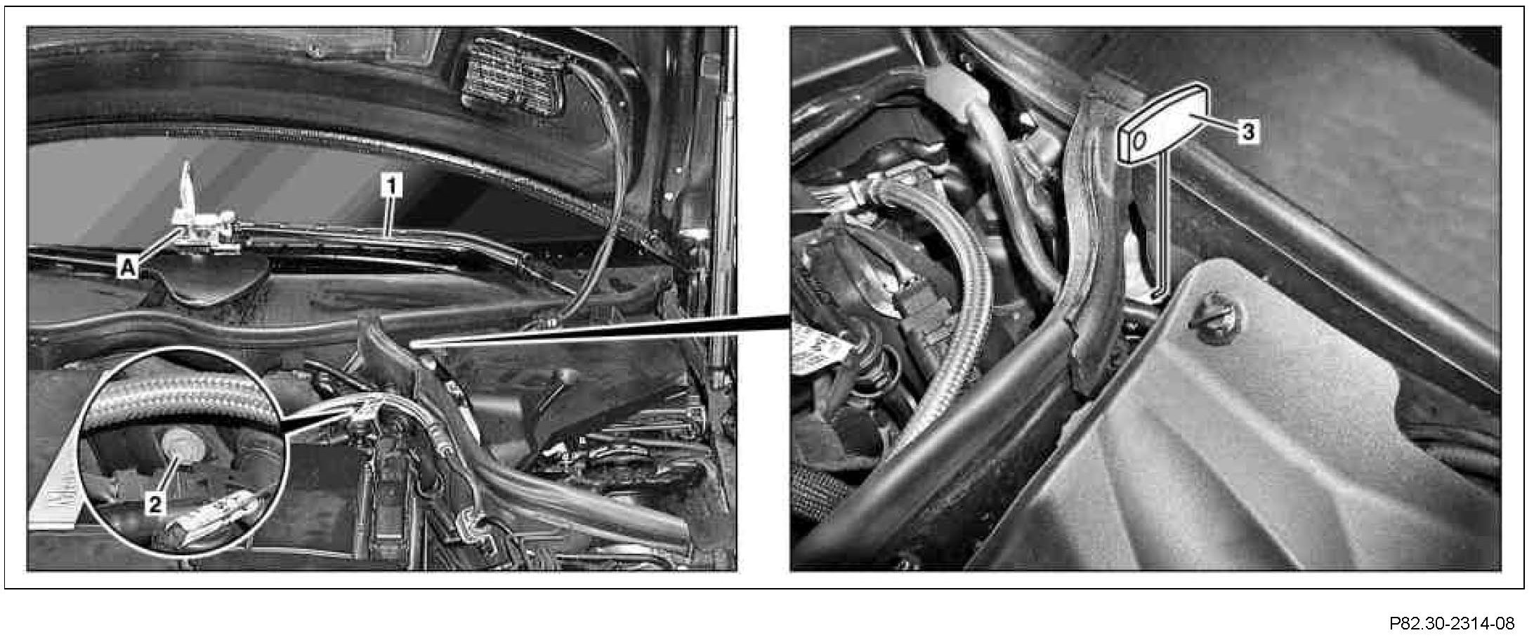 6 Close hood and remove choke angle gauge (A) from driver-side wiper arm (1).