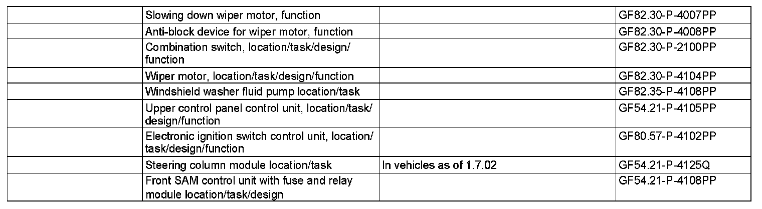 - the front SAM control unit with fuse and relay module (N10/1) actuates the wiper motor (M6/1) and the windshield washer fluid pump (M5/1).