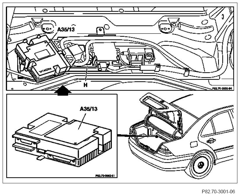 Depending on the vehicle equipment, the accessories plate must be supplemented by the bracket (H) for transmitter/receiver or Tele-Aid. See parts catalog.
