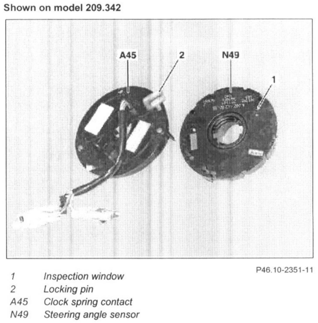 - If the basic position of the steering angle sensor (N49) relative to clock spring contact (A45) has changed, or a black tooth is visible in window (1), the basic position must be restored.