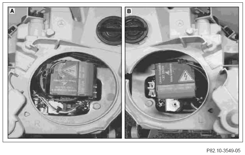 Note installation position: right xenon headlamp ignition module (A) and left xenon headlamp ignition module (B).