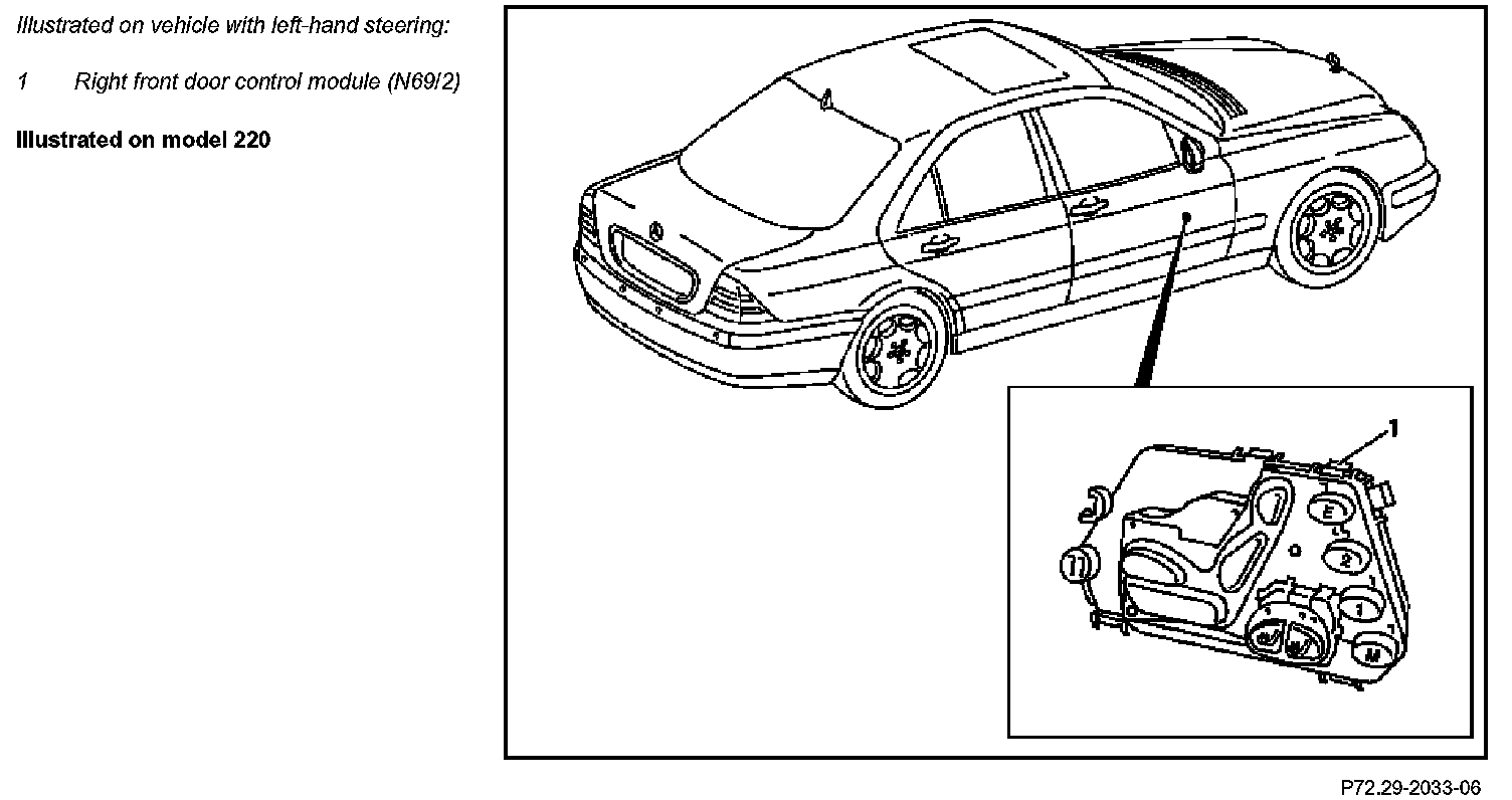 The right front door control module (N69/2) (vehicles with right-hand steering: left front door control module (N69/1)) is located in the passenger door below the door liner.