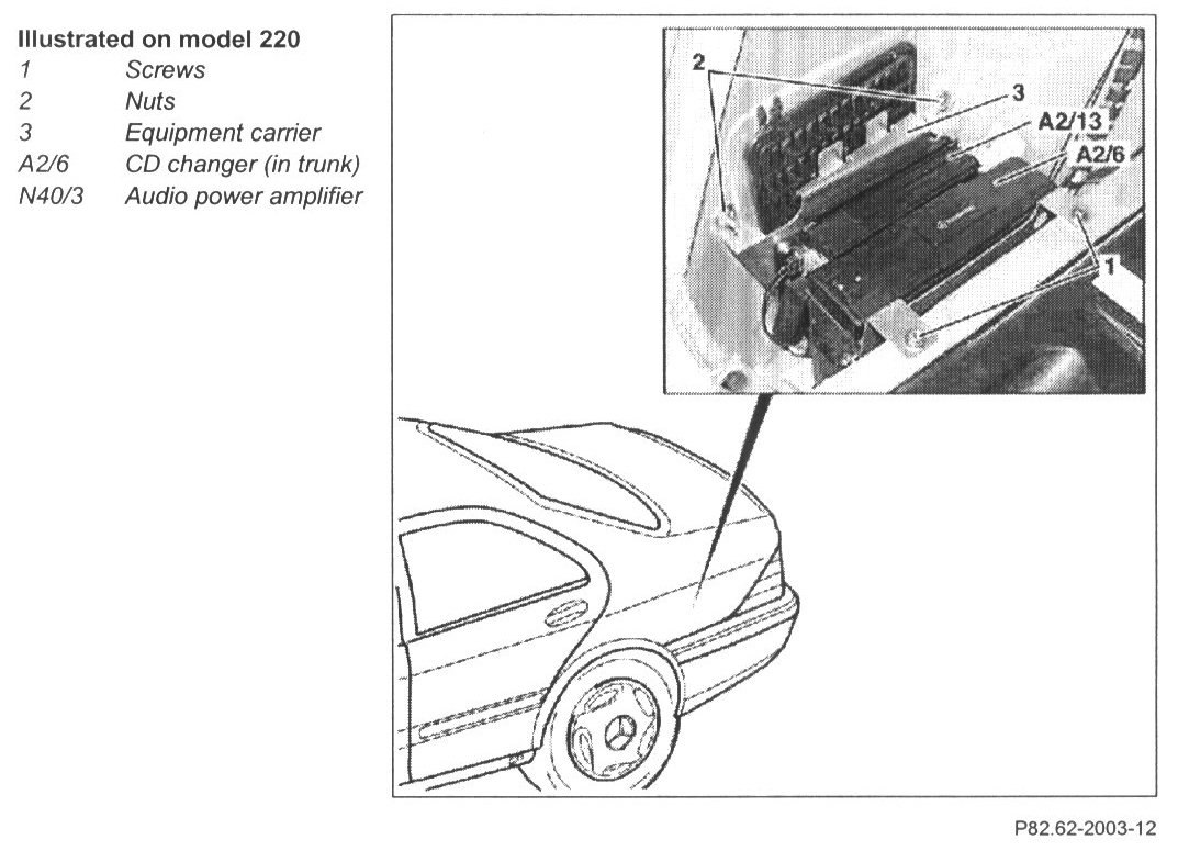 6 Remove CD changer (in trunk) (A2/6) from equipment carrier