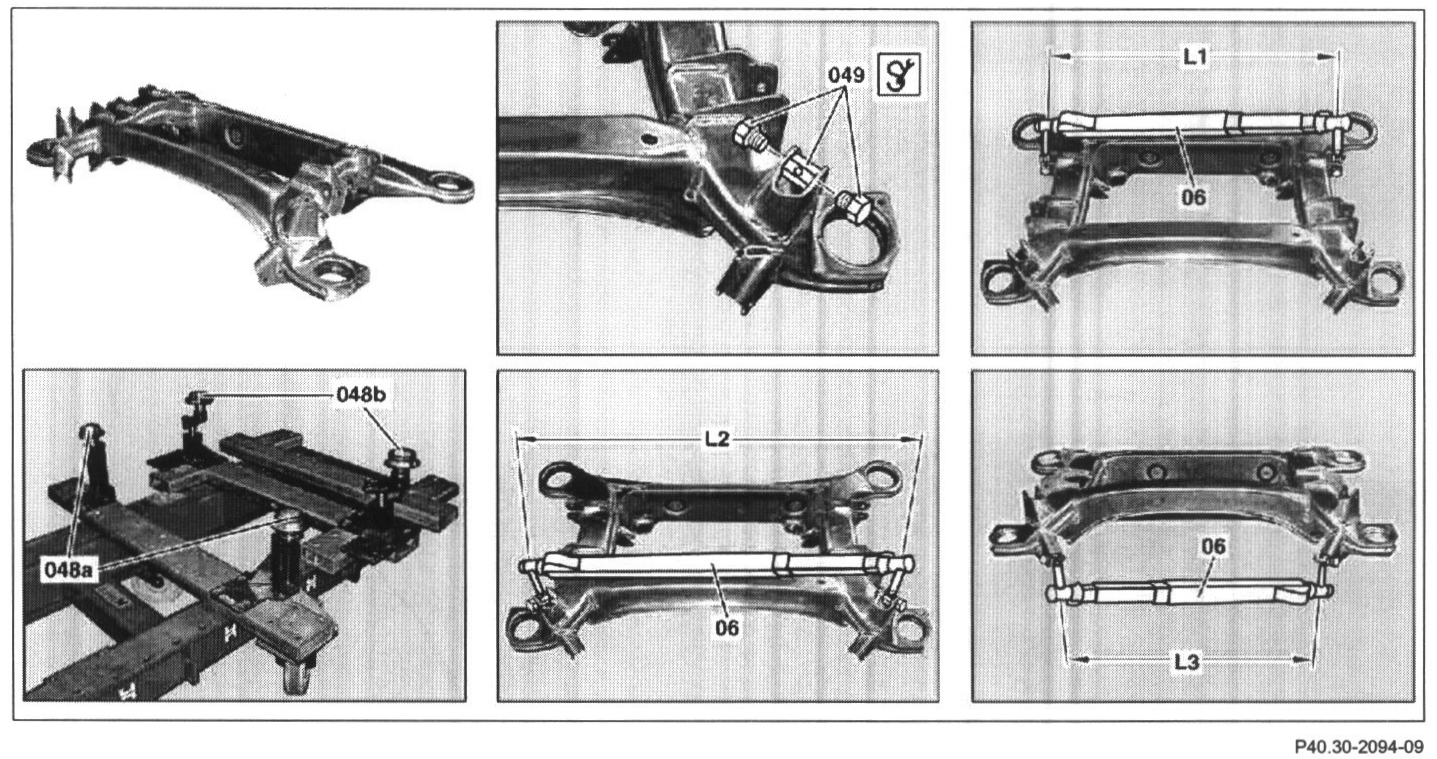 5 Place rear axle carrier complete (with axle halves) or as an individual part on the checking fixtures (048a, 048b)