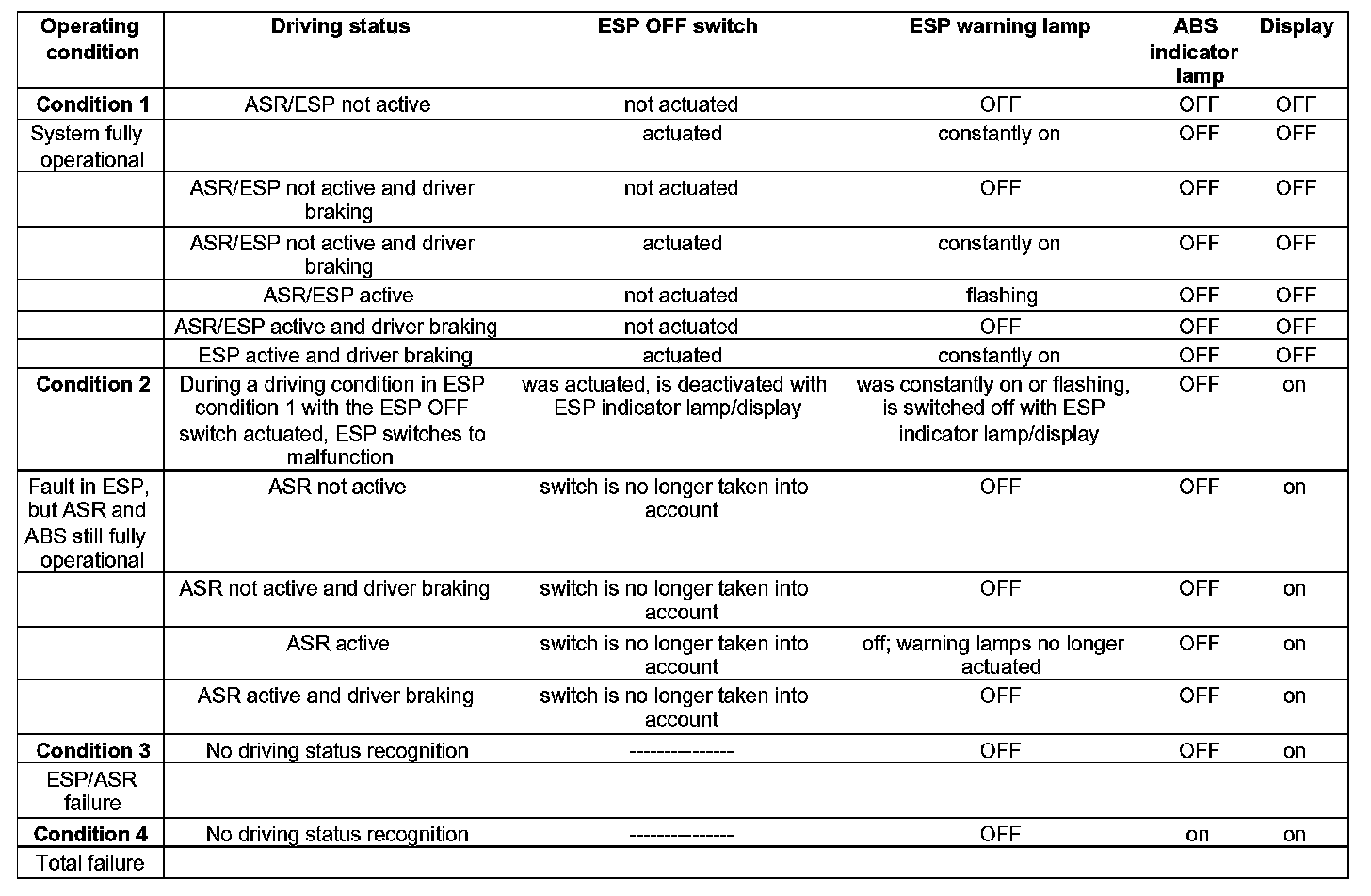 Fault in ABS (of necessity ESP, ASR and BAS must also be shut down), no systems operational