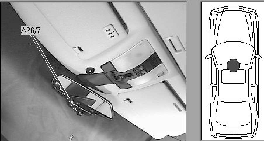Interior, beneath rear view mirror.