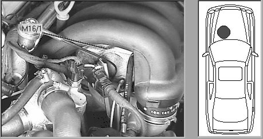 Engine compartment, left center, beneath intake manifold.