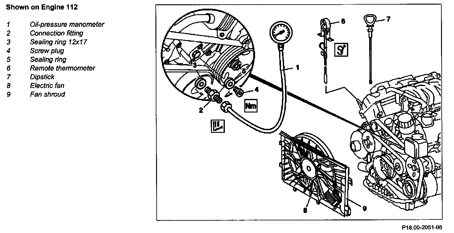 5 Connect oil-pressure manometer (1) to connecting pipe (2) on timing case
