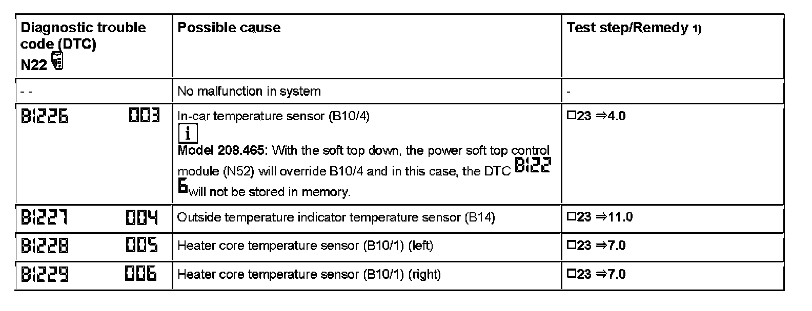 - The A/C pushbutton control module (N22) has DTC memory and data output. The diagnostic trouble codes and data are displayed via the temperature display window. The stored DTC's will remain in memory even with the vehicle battery disconnected.