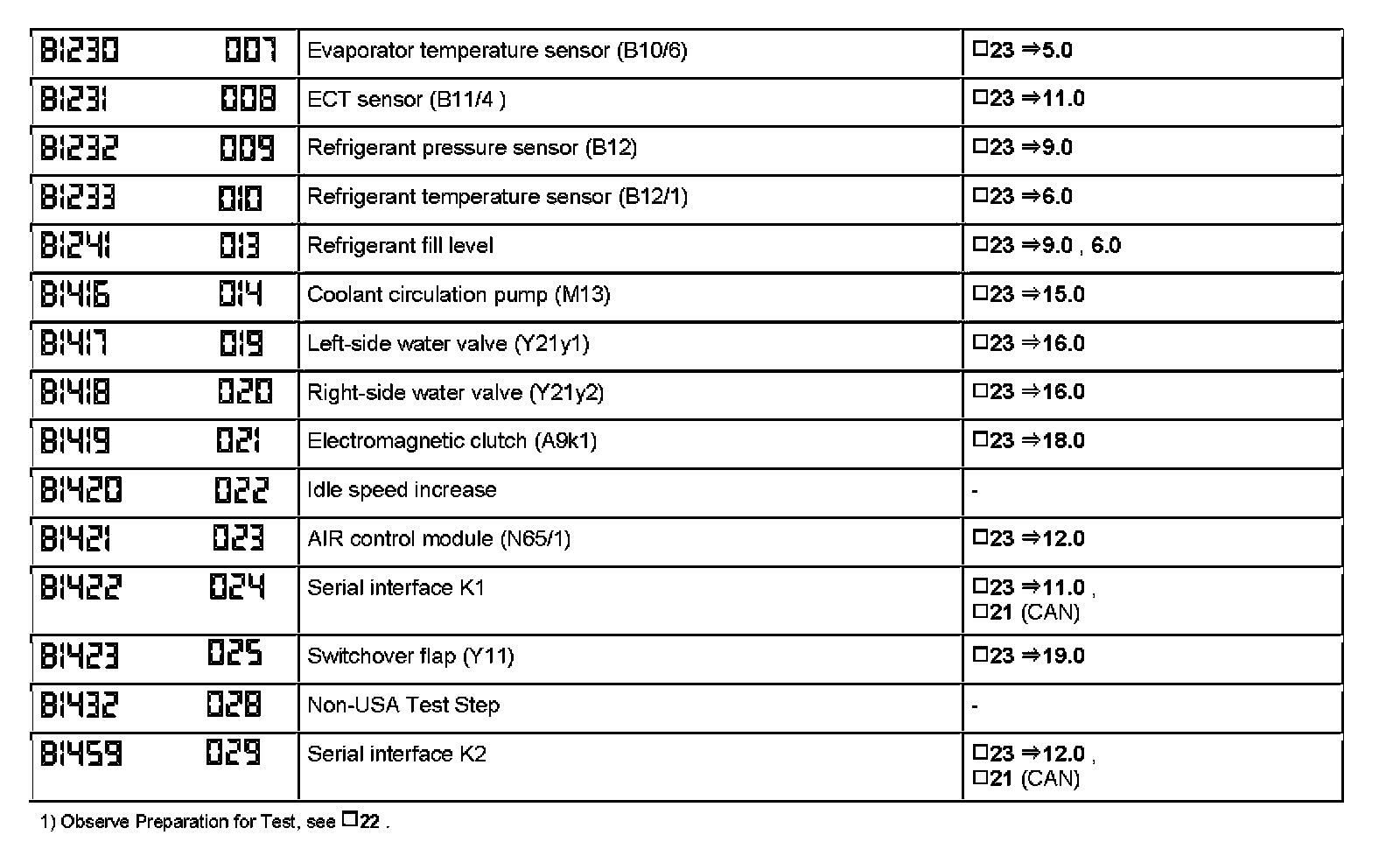 The current faults (refer to table) are displayed first, next, the intermittant failures (e.g. 45 °5) are displayed in the display window next to the FAN symbol. By pressing the right AUTO the next DTC is displayed.