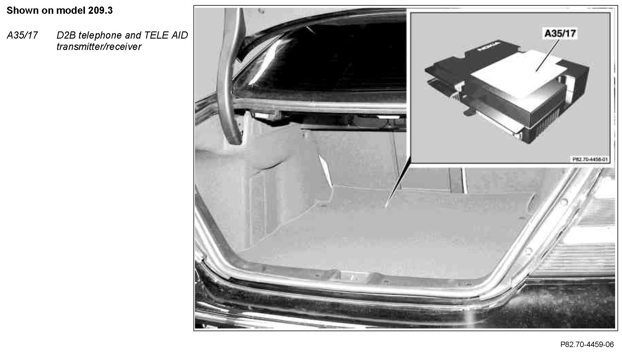 The telephone transmitter/receiver and TELE AID, D2B (A35/17) is installed in the control unit block on the luggage compartment floor behind the rear bench seat.
